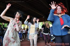 Leading up to the Zombie Walk is the annual Thrill The World Dance. Dozens of reanimated corpses join forces in a street performance to the Thriller song by Michael Jackson. Portland zombies take the Thrill the World Dance seriously. Weeks of practice precede the event. Like the Zombie Walk, the Thriller dance is organized by volunteers. Thrill the World Portland 2016 was a benefit for the Sexual & Gender Minority Youth Resource Center (SMYRC) and Sankofa Collective Nortwest. The 2015 Thrill the World dance in Portland also benefited SMYRC.